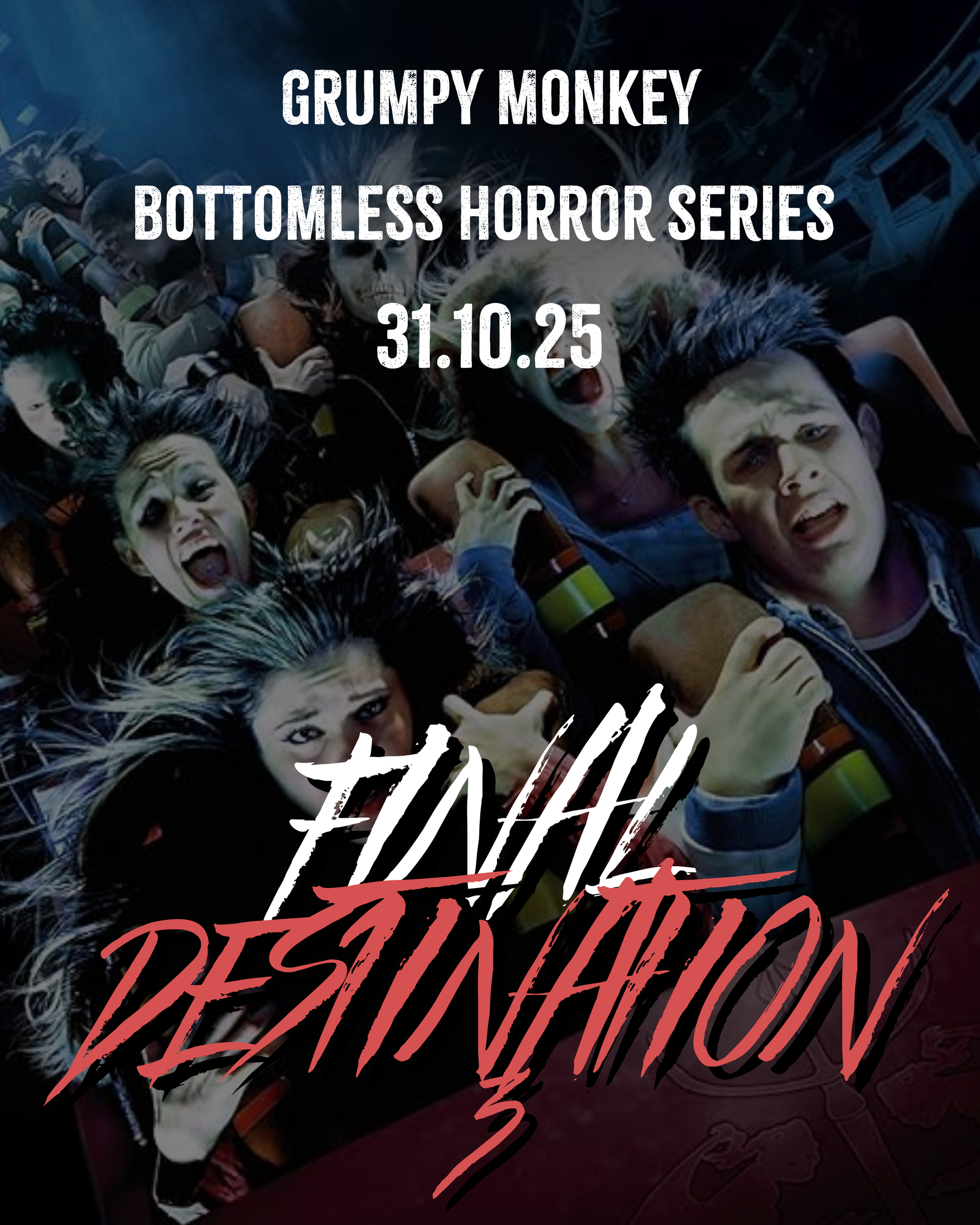 Watch Final Destination 3 at Grumpy Monkey on Halloween (31st of October) enjoy our Bottomless Brunch (£35 per person) and Popcorn for each booking!.