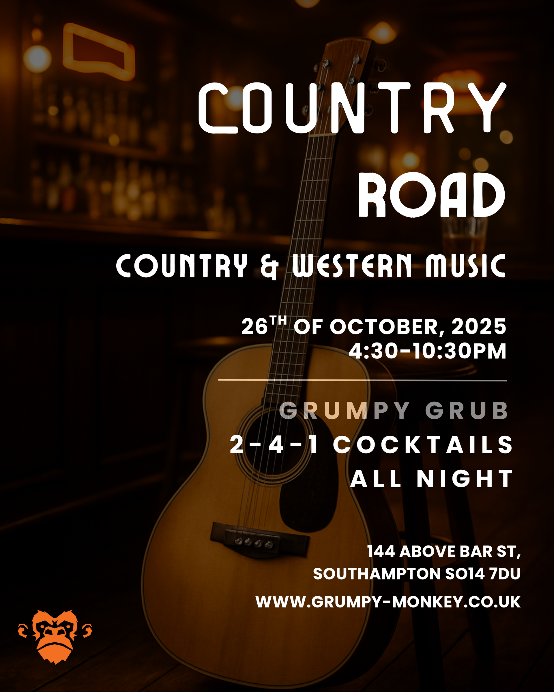 Come along to Grumpy Monkey on the 26th of October and enjoy an evening of country and western music with 2-4-1 cocktails all night as well as our grumpy grub menu!